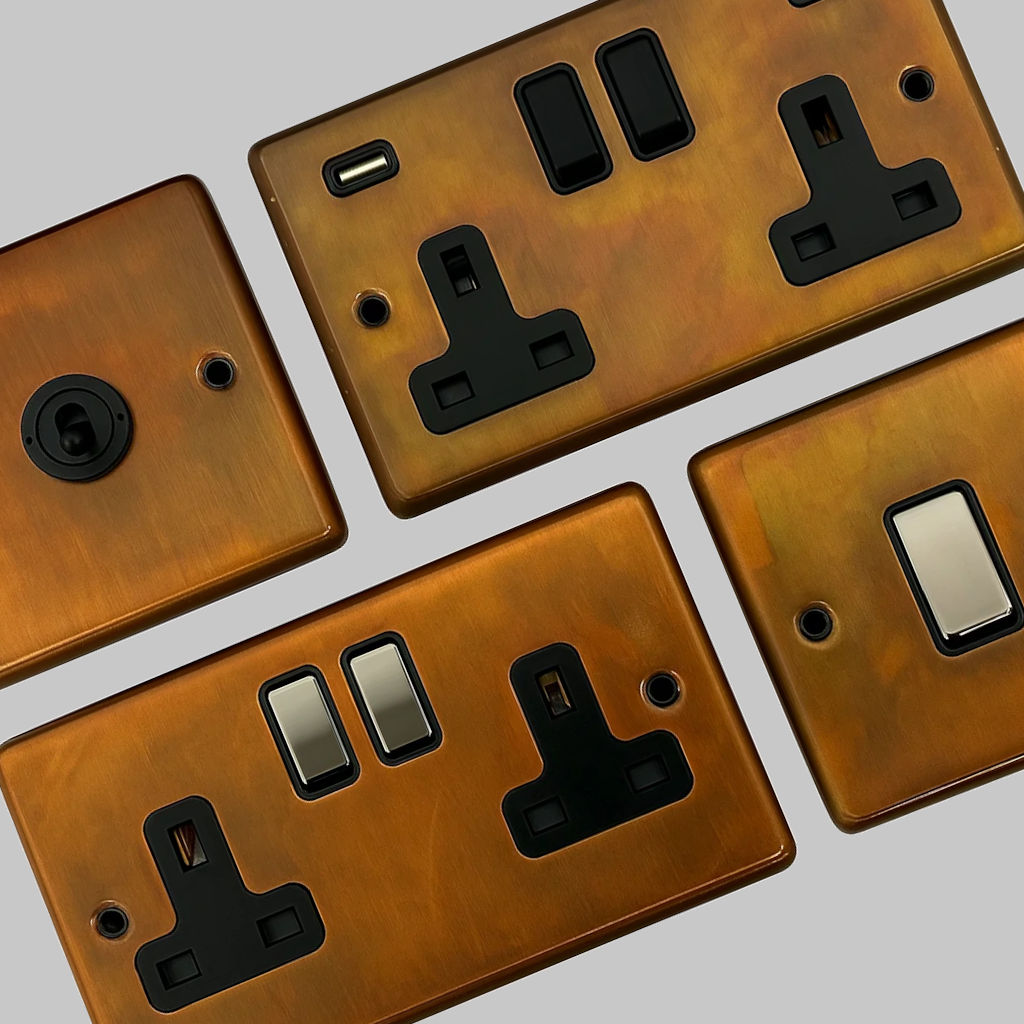 This is our range of Contour tarnished copper sockets and switches, available to buy now from Socket Store.