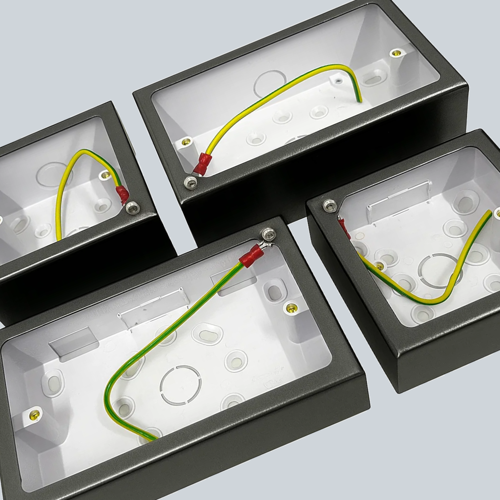 They are made out of plastic boxes with metal surrounds finished in a pewter effect. They are 32mm deep. Please note the surrounds are solid metal.
