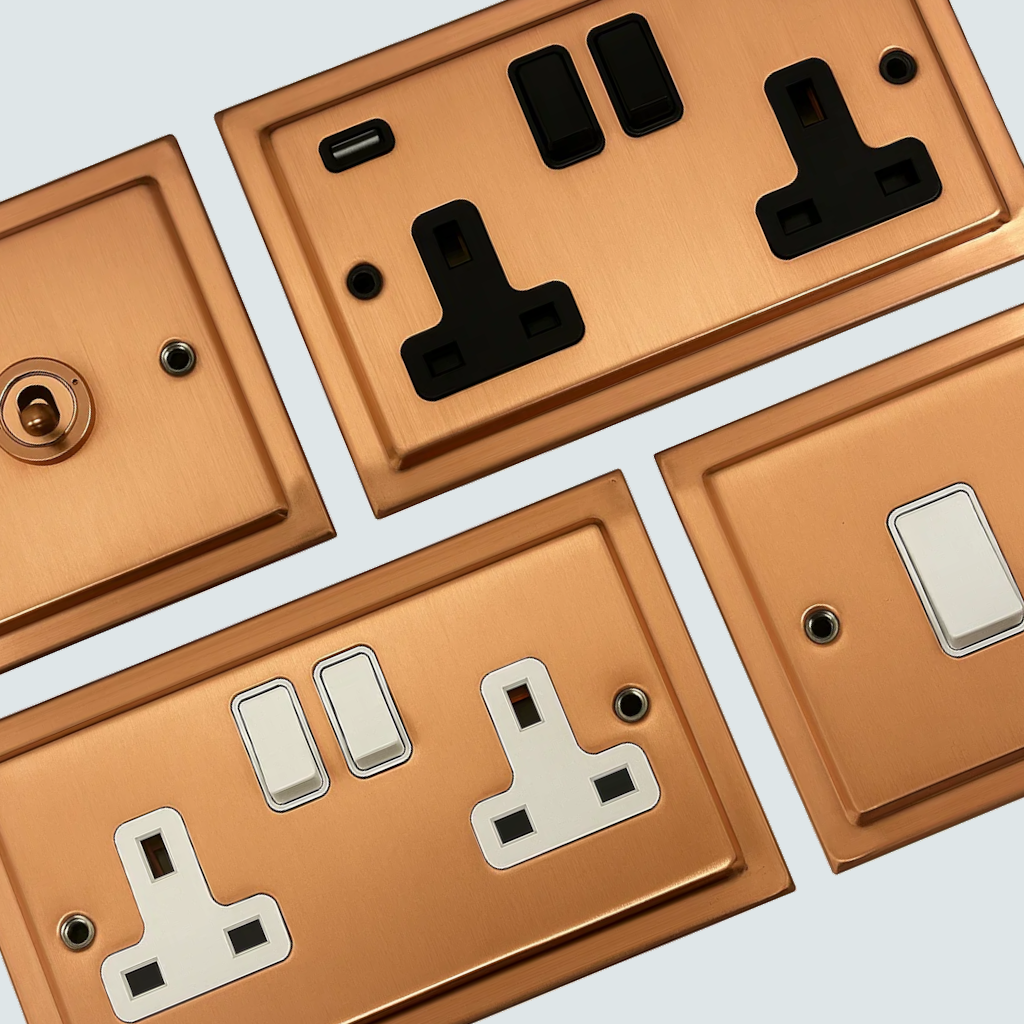 This is a range of Rose Gold sockets and switches with a Victorian stepped style, from G+H Electrical Accessories.