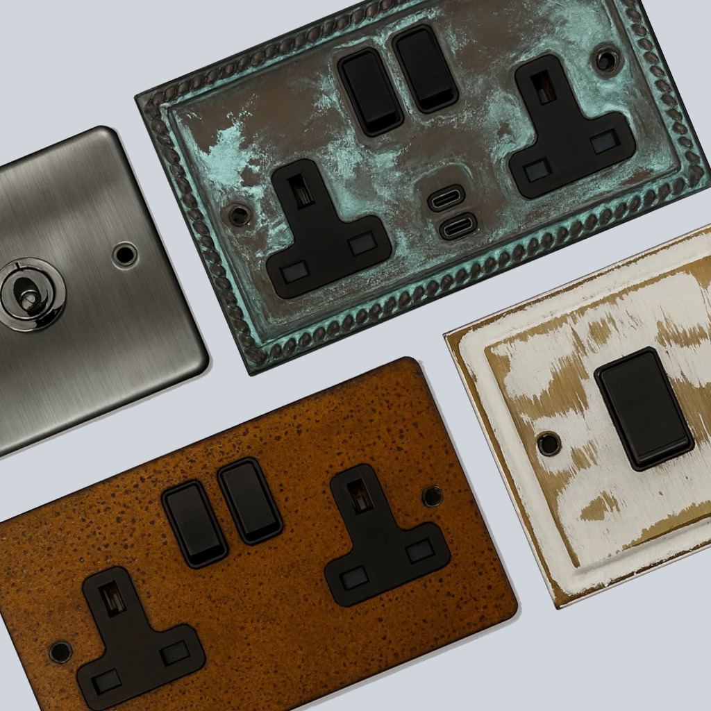 These rustic hand made and unusual finished sockets and switches are available as a complete range of electrical accessories. A range of rustic silver, slate effect and Verdigris sockets and switches available to buy online at Socket Store.