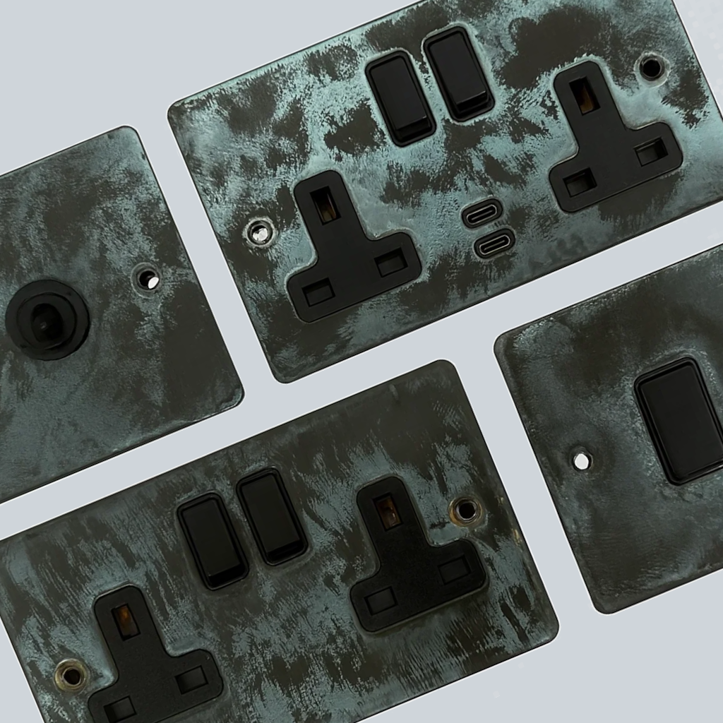 These are unique flat Verdigris sockets and switches on a flat plate.