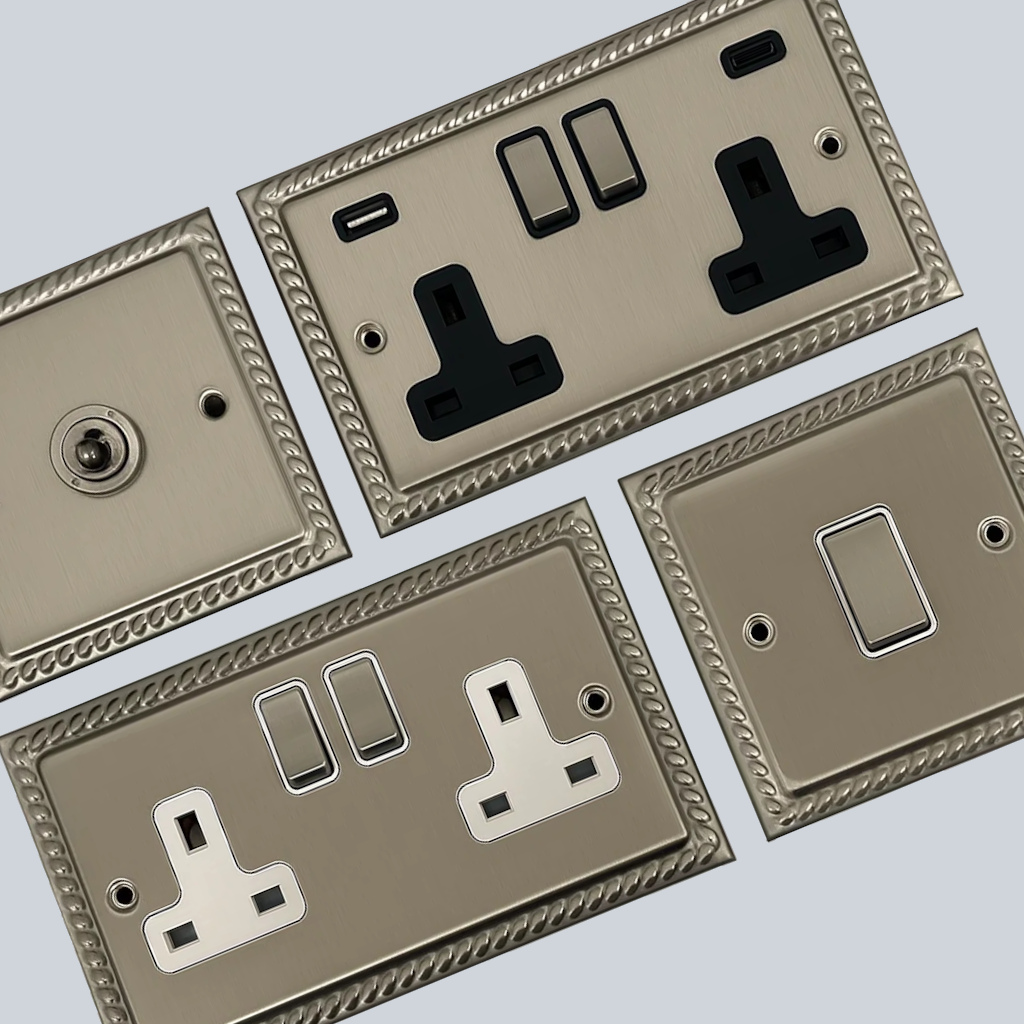 Browse through our range of Georgian brushed nickel sockets and switches with beautiful roped edges.