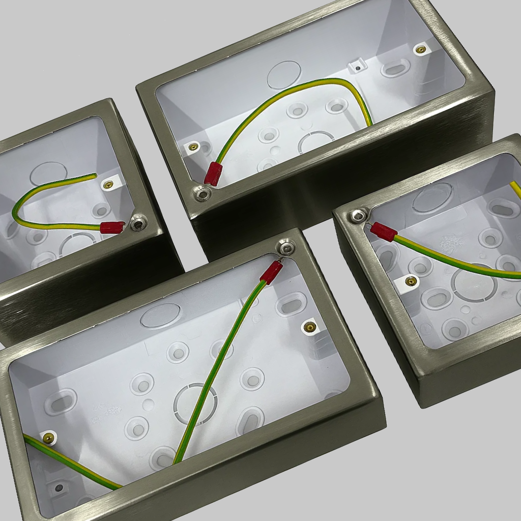 These are available as single or double pattress boxes, also called brushed steel surface boxes. They have a plastic pattress box surrounded by a satin nickel finished metal surround.