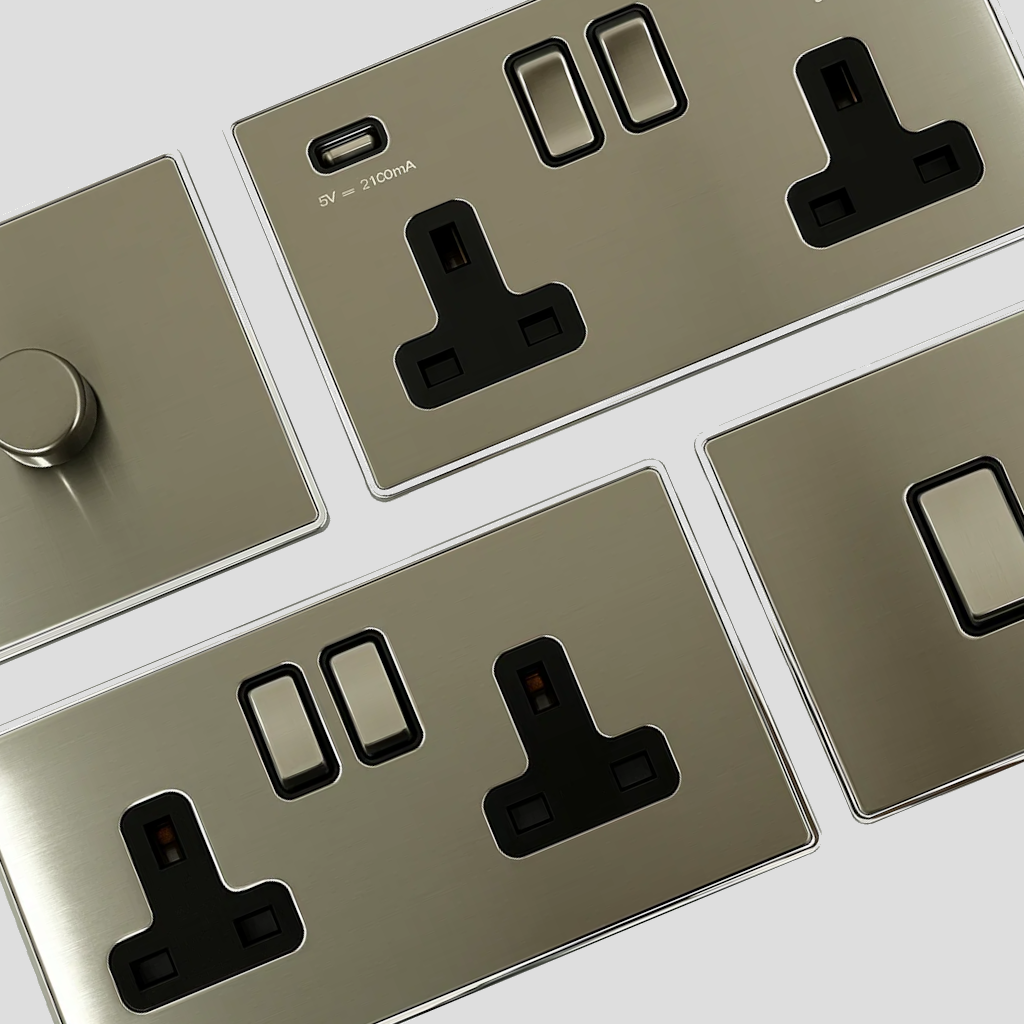This is the Lexus range of screwless brushed steel sockets and switches from G+H Electrical Accessories.