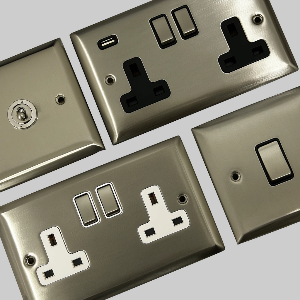 The spectrum range of brushed steel sockets and switches have a bevelled edge.
